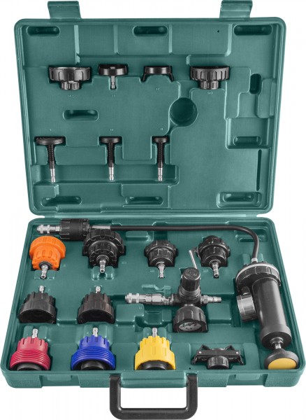 Прибор применяется для проверки радиаторов системы охлаждения ДВС, трубопроводов, деталей и соединений на предмет утечек рабочей жидкости. Специальные адаптеры обеспечивают соединение ручного насоса или линейного редуктора-регулятора с горловинами радиаторов и расширительных бачков систем охлаждения автомобилей производителей: VAG, BMW, CITROЁN, PEUGEOT, FIAT, FORD, OPEL, VOLVO и аналогичных.