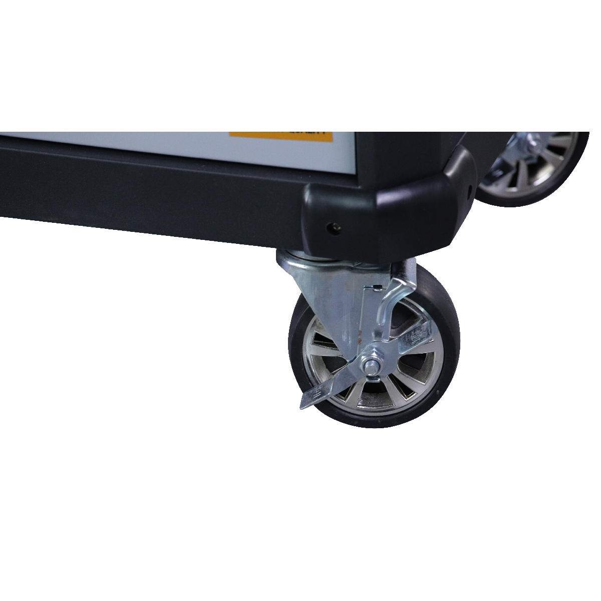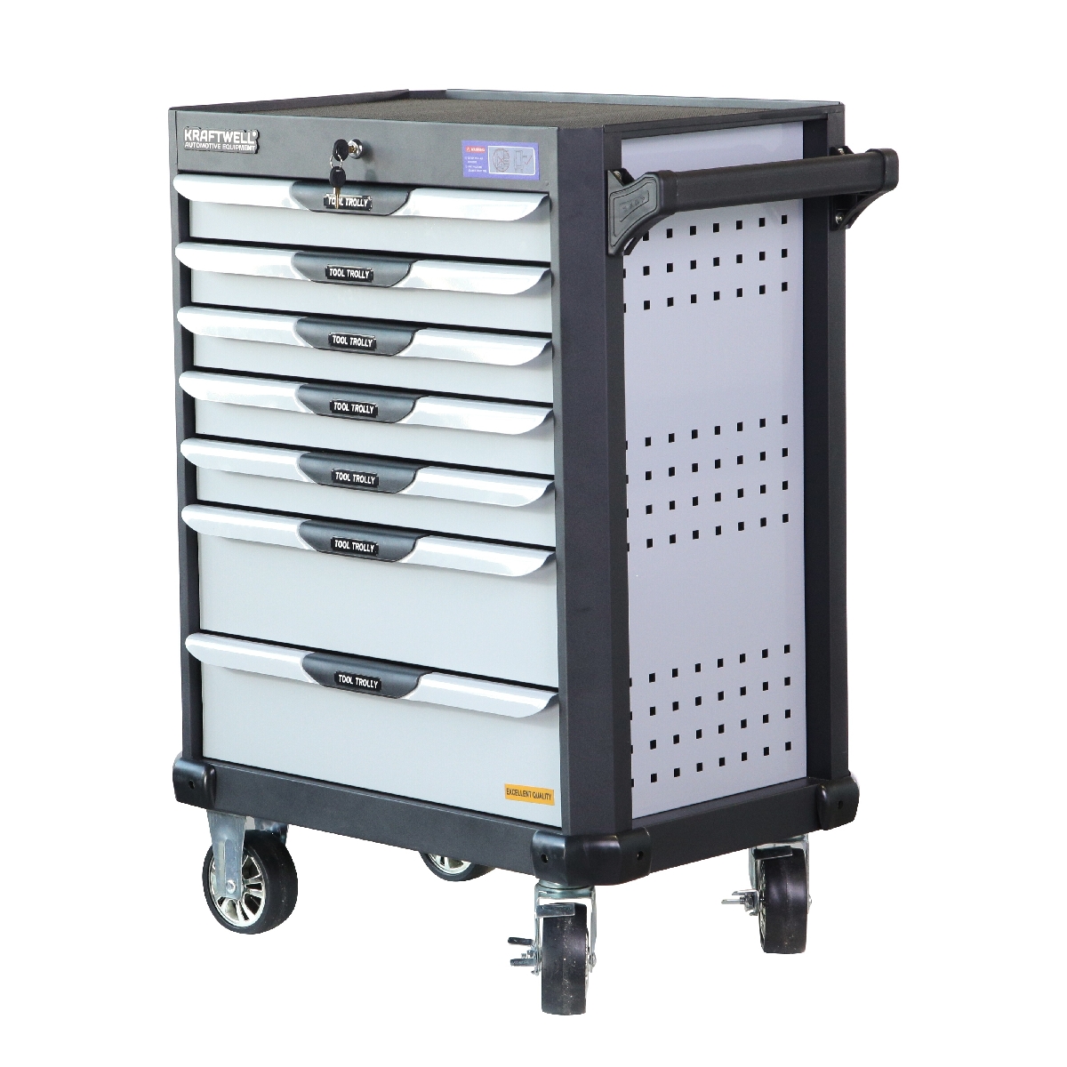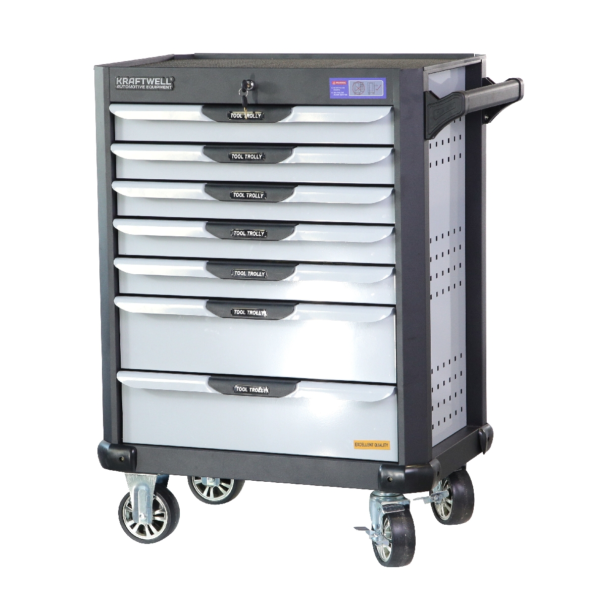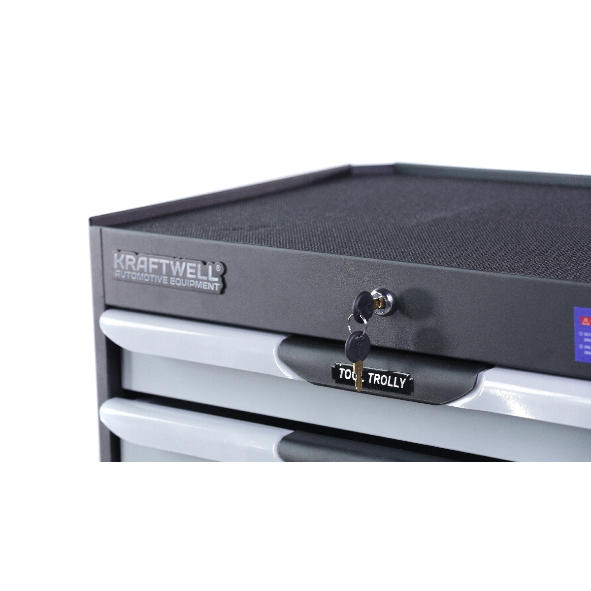 Инструментальная тележка KRW-TTB оснащена 7-ю выдвижными ящиками. В ПОДАРОК 6 ящиков укомплектованы ложементами с инструментом (277 предметов). Тележка предназначена для оборудования рабочих мест в автосервисах, мастерских и других производственных помещениях. Телескопические направляющие ящиков имеют механизм фиксации, не позволяющий самопроизвольно открыться ящику, даже если внутри находится инструмент, а также доводчиком, обеспечивающим плавное закрытие ящика. Корпус тележки изготовлен из высококачественной стали и окрашен порошковой краской. Перфорированные боковины предусматривают установку крючков. Для перемещения тележки предусмотрены обрезиненные стальные колеса Ф100 мм, одно из которых имеет стояночный тормоз.
