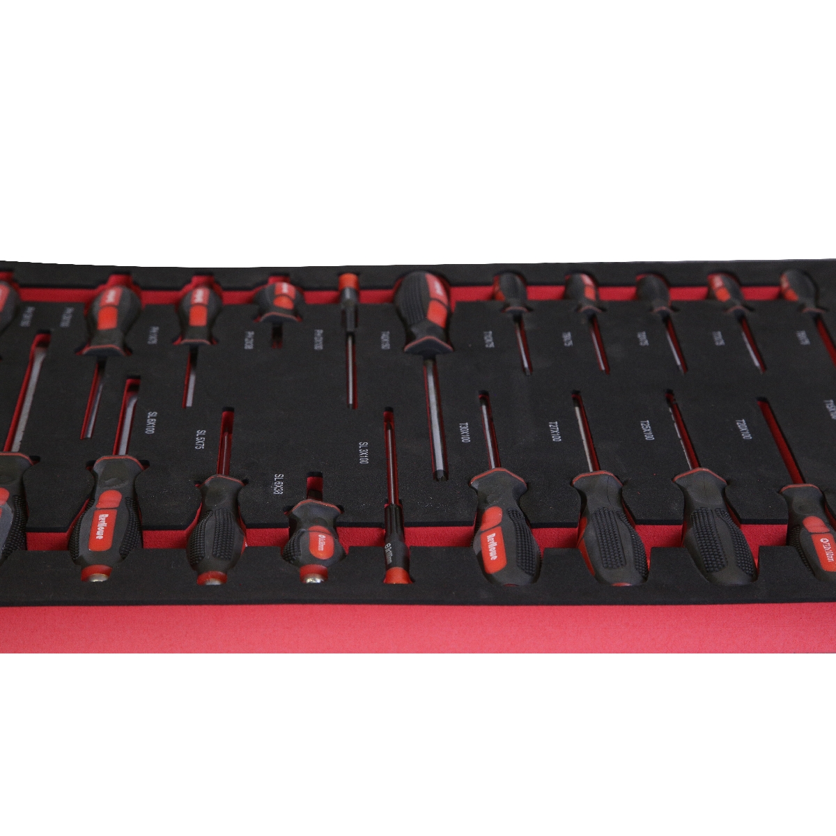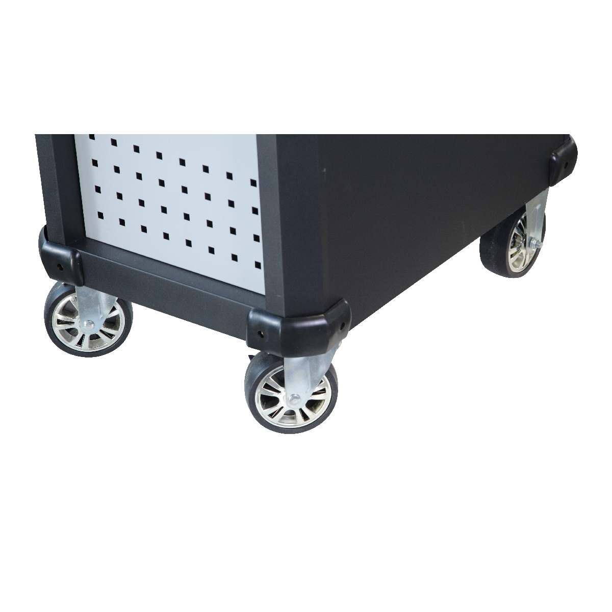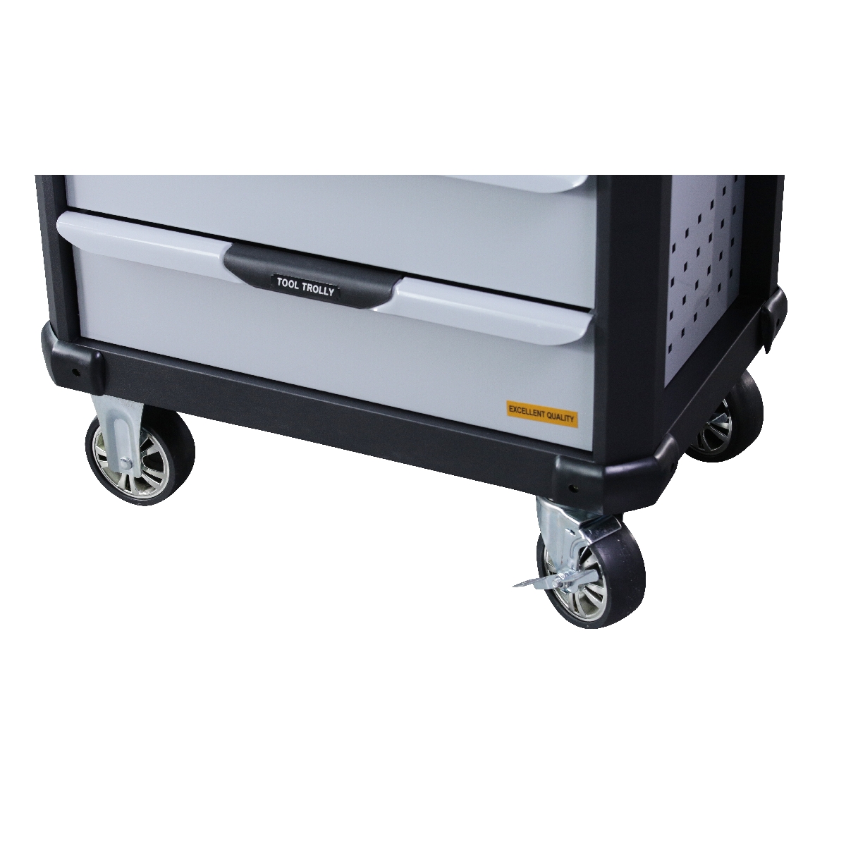 Инструментальная тележка KRW-TTB оснащена 7-ю выдвижными ящиками. В ПОДАРОК 6 ящиков укомплектованы ложементами с инструментом (277 предметов). Тележка предназначена для оборудования рабочих мест в автосервисах, мастерских и других производственных помещениях. Телескопические направляющие ящиков имеют механизм фиксации, не позволяющий самопроизвольно открыться ящику, даже если внутри находится инструмент, а также доводчиком, обеспечивающим плавное закрытие ящика. Корпус тележки изготовлен из высококачественной стали и окрашен порошковой краской. Перфорированные боковины предусматривают установку крючков. Для перемещения тележки предусмотрены обрезиненные стальные колеса Ф100 мм, одно из которых имеет стояночный тормоз.