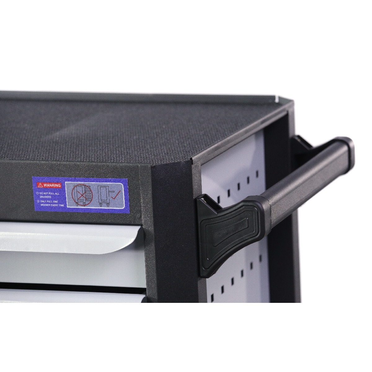 Тележка инструментальная с 7 выдвижными ящиками. Цвет серый/черный. Ящики на телескопических направляющих с фиксацией и доводчиком. В ПОДАРОК - комплект инструмента 277 предметов на 6 ложементах.