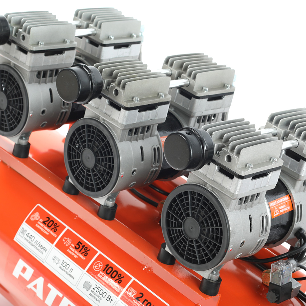 Компрессор безмасляный Patriot WO 100-440. WO 100-440 – производительный и тихий безмасляный шестипоршневой компрессор, обеспечивающий пневмоинструмент чистым воздухом. Предназначен для работ в лабораториях, в мастерских, на производстве, идеален для покрасочных работ.