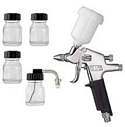 Универсальный комплект для художественных работ SATAjet 20 B с 65-мл пластиковым бачком, тремя стеклянными баночками с крышками и баночкой с сифонной трубкой.