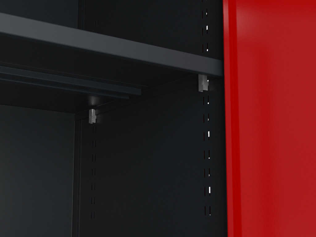 Отсек с дверками используется для хранения инструмента в кейсах, переносных сварочных аппаратов, пневмоинструмента и т.п. Пространство отсека делится регулируемой по высоте полкой на две части. Шаг регулировки - 25мм. При желании полку можно вовсе демонтировать.